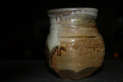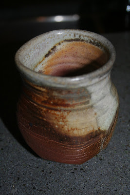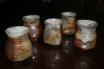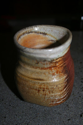 The pictures above are a cup from this last firing with a shino glaze on the inside and a ground local clay ongobe on the outside, I’m showing three pictures of the same cup. The second is a lidded jar, shino glaze, thrown as one piece and then split at leather hard stage. And these below are new additions: