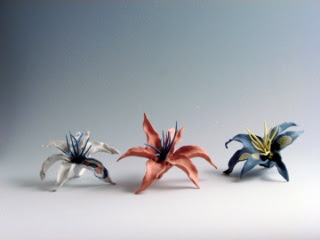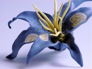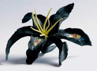 Judy is another of the wonderful artists I met while in Red Deer (oh what a time I had there!) These images are of some recent work she started last year. She says “I have been doing all sorts of things related to genetically modified food and plants. These small coloured clay flowers (3-5 cm) are inspired by Asian lilies, but are “modified” with thin laminations of geometric millifiori. I grow some real lilies in my rock garden here in the Alberta foothills, but bears do come out the woods to nibble on them – a different kind of modification!”