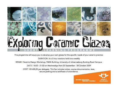 Exploring Ceramic Glazes is the first of a number of short courses in ceramics planned at the University of Johannesburg . This course is aimed at the ceramist who wants to increase his or her knowledge of glazes and glaze development. It will take place over 6 weeks in weekly 3hour sessions. Program runs September 23rd – 28th of October. If you would like more information on this please contact John Shirley at [email protected] http://johnshirleyceramics.blogspot.com