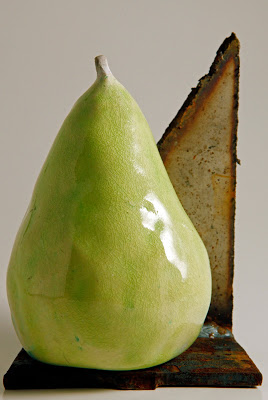 “I am a clay artist living in Chapel Hill, N.C. I combine wheel throwing and hand building in my work and fire Raku and cone 10 reduction. I teach hand building and Raku classes at the Artscenter in Carrboro N.C. and sell my work in local galleries and art festivals. In 2008 the Orange County Arts Commission awarded me an artists project grant for a gas/raku kiln. I have been experimenting with raku glazes for the past year and in August of 2009 I attended a Raku workshop at Penland with Steven Forbes deSoule. The metal stand for the pear was found outside the metal shop at Penland and the chartreuse glaze was a glaze we experimented with during the workshop. Chartreuse glaze Raku fired to 1950 f in an Olympic torchbearer gas/raku kiln”