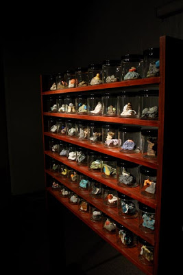 Piece consists of 48 individually lighted jars with a ceramic sculpture in each jar.