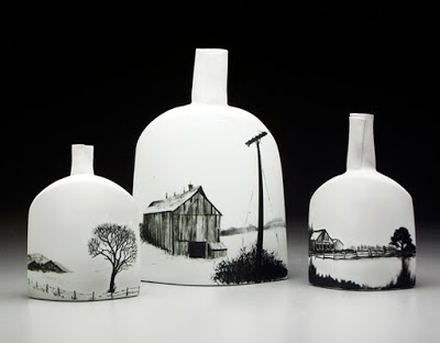 “My ceramic practice includes vessel making, sculpture and most recently jewelry. It’s heavily weighted toward surface considerations. Most pieces are made of unglazed porcelain with hand-drawn, monochromatic decoration. The imagery on my work comes from my immediate environment and has transitioned from urban to rural accordingly.”