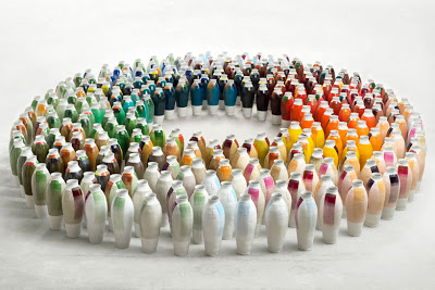 “entitled ‘300 coloured vases’, the installation consists of three series of coloured vases in which the designer has experimented in colour, using the vessels as her ‘canvas’. the first two series are a collection of forty and forty-two vases respectively, each partially coated with paint from the industrial color ranges RAL (2003) and NCS (2007).