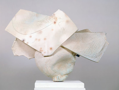 It was Soldner’s openness to the creative accident that led him to the “discovery” of American Raku. “He was invited to demonstrate at a crafts fair in 1960. Using Bernard Leach’s A Potter’s Book, as a guide for traditional Raku, a Japanese technique developed in the 16th century, he set up a simple kiln and improvised a few lead-based glazes. The initial results were disappointing but his fascination with Raku persisted, and Soldner continued to experiment [originating post-fire smoking artwork, now known as American Raku]. He gradually discovered he was more interested in Raku as an aesthetic than as a tradition. This attitude resulted in a much more playful approach to form, scale, function, and material.” (Garth Clark)