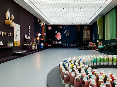 “entitled ‘300 coloured vases’, the installation consists of three series of coloured vases in which the designer has experimented in colour, using the vessels as her ‘canvas’. the first two series are a collection of forty and forty-two vases respectively, each partially coated with paint from the industrial color ranges RAL (2003) and NCS (2007).