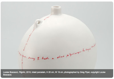 Utilizing a variety of printmaking techniques, Jacqueline Robins illustrates and imprints the clay. When it is fired, the images and words are forever embedded in its surface. Her vessels are thus a narrative record: fragments of love letters, sheet music, photographs, maps, mementoes, and found treasures.