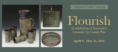 Connie Pike has been a professional potter and ceramic artist in Alberta since 1978. Her approach to working with clay evolves as she investigates function and aesthetic. Shapes and designs build upon themselves and new versions of form and decoration filter through her body of work and refresh the process. Connie’s love of detail and drawing is the major influence on the work featured in Flourish. With a focus on using texture and line, Connie carves her drawings into a lino block tile and rolls the impression into the soft clay. She has adapted this method to decorate her tiles, trays, book covers, boxes, vases, mugs, glasses, jugs and vessels.