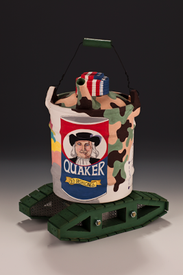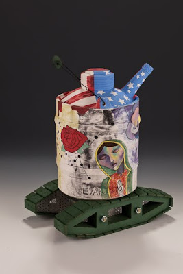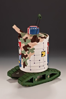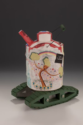 “Oilcan Tanks”. The cans are wheel thrown and are decorated with underglaze. The treads are made up of wood and metal.