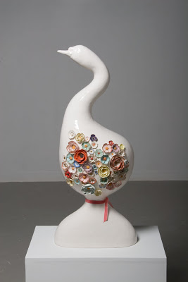 Narwhal Art Projects is pleased to present Pretty, Strange, an exhibition of works by Julie Moon from August 11th to September 4th, 2011. Inspired by the tactility and anthropomorphic qualities of clay, Moon’s undulating, organic sculptures pay reference to the human form through their limb-like protuberances and rolling, fleshy surfaces. These indelicate figures contrast sharply with the dainty ornamentation with which they are applied: from their pastel palette to their intricate overlays, each piece deliberately juxtaposes effete flourishes with corpulent silhouettes. The result is an imbalance between elegance and awkwardness, forcing the viewer to confront their own preconceptions of beauty, femininity and alterity. Consisting exclusively of ceramic media, Pretty, Strange incorporates wall-mounted sculpture as well as freestanding forms. The addition of surface applications and glazes, fabric, frill and lace trim informs the unique identity of each piece: in Ballerina, a pointe slipper adorns the toes of an otherwise bloated and distended leg-like appendage, while Shoe farcically applies a delicate pattern to a bulbous-looking foot. The effect is reminiscent of the frivolous figurines of a china cabinet, albeit without the grace, delicacy and literal representation of such traditional ephemera. Pretty, Strange is the culmination of Moon’s thesis work at the New York State College of Ceramics at Alfred University as well as her current residency at the Center for Ceramics in Berlin. Moon has previously shown both locally and internationally, most notably through her solo exhibition Pretty Pleas at the Fosdick Nelson Gallery in New York State (2010).