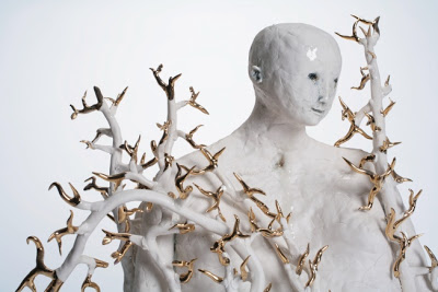 Claire Curneen is one of Britain’s foremost figurative ceramicists, renowned for the haunting, emotive porcelain figures that she has been making for over 10 years. Fascinated by the human body, she explores themes of human alienation, femininity and the combination of bodily flesh and spiritual existence. Her making technique, a kind of porcelain patchwork, results in figures that are covered in handprints and shallow lines like contours or scars. These naked figures have extraordinary presence, awkward and vulnerable yet also self-contained and inscrutable. ‘Daphne’. The subject draws on the story of Apollo and Daphne. In the painting by Antonio del Pollaiuolo the Greek God pursues Daphne, she is grabbed by Apollo, he persists in having her but she prays to the Gods to help her and she is turned into a tree, her arms shoot upwards and become strong branches which towers over Apollo. Curneen’s interpretation show the porcelain figure is in a state of change, the branches engulf her and they are topped with gold suggesting the delight in her fate.