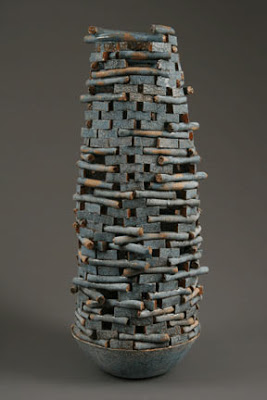 Seattle-based Kraft has worked in ceramics for over 30 years, and likes the idea of being a part of the long history of people making things with their hands. He has described his own work as an evolution of ideas, often influenced by the natural world and native cultures. Kraft often works with the idea of smaller parts making up the whole, and this can be seen clearly in pieces such as “White Keep” or “Kala”. These large vessels are made using coil and brick-like pieces, or cut and torn clay parts assembled to create a vessel which appears basket-like. Kraft’s use of texture in the clay is exciting, and this exploitation of texture, combined with his use of natural colors for surface treatment, further trick the eye into seeing a different material.