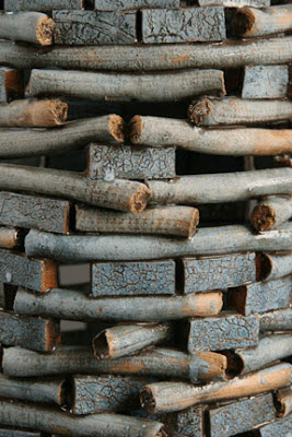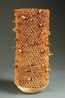 Jim Kraft’s work is compelling yet deceptive. Kraft builds large container forms by using small pieces of cut or torn clay which is constructed in such a way as to appear as a completely different material. This manipulation of the clay creates a visual deception, of baskets constructed of wood, fiber or cork pieces when in reality, they are ceramic.