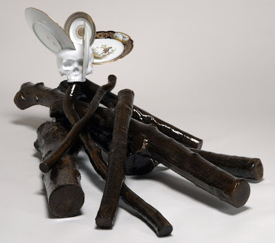 the surrealistic quality of mechita’s style is infused into each piece; her vision is expressed through the incorporation of stoneware, porcelain and a varied color palette through out the collection. she highlights the normalcy in mortality and the passage of time by flooding each sculptural space with interactions between light and deathly motifs. all sculpted figures are decorated with vibrant colors, beads and glitter long after their demise. the bright additions to each figure stream from eye sockets of a sculpted skull or the neck of a decapitated animal, promoting a unique visual experience based in the proximity and juxtaposition of the two themes.”