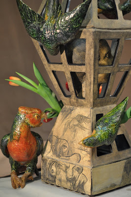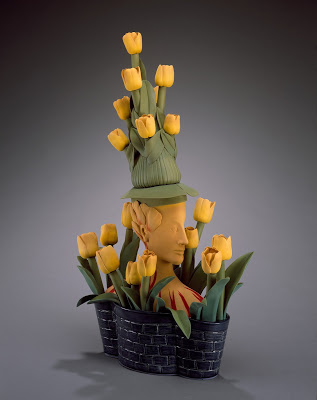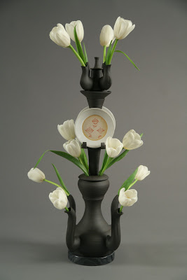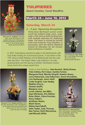 In 1637 Tulip Mania reached its peak in the Netherlands with tulip bulbs trading for astronomical prices. It was there in the 17th century in the Delft Potteries of the Netherlands that the tulip vase was born. Originally a 17th century Delft stacking form with multiple openings for displaying tulips. The Skagit Valley to the north of Seattle rivals Holland in its tulip growing fame and it is there at the Museum of Northwest Art in La Conner that ceramic artists will revisit this unique vessel form. Tulipiers or Tulip Vases , as a form, present a unique challenge and creative opportunity for ceramists. Carol Gouthro, guest curator and ceramist , invited 32 northwest ceramic artists to create Tulipiers in their own style.