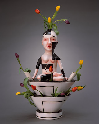 For many contemporary artists working in clay sculpting representations of the human figure, associations with and references to the figurine are natural. Figurines, diminutive tabletop sculptures, representing man and or beast have lived in almost every home globally, regardless of place, culture or time. Early clay examples date back some 30000 years. Throughout time these figures have represented many things. From fertility icons to religious symbols, common man to Kings, from singular figures to ornate and complex compositions, these intimate sculptures commemorate(d) everyday and heroic acts, modern day folk and pop cultural figures, and historically significant events. Artists participating in Figure/Figurine include Christyl Boger, Jeremy Brooks, Anna Noel, Kensuke Yamada, Carole Epp, Beth Lo, Mathew Groves and Mara Superior. Each of these makers uses the history of the figurine to create works that live comfortably in our contemporary world.