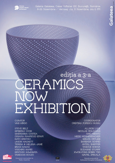 In the context of the globalization of arts and of rapid exchange of information, it is more and more necessary to make a serious coagulation of what is contemporary ceramics. The incorporation of many diverse subjects, working techniques and mediums in creating a ceramic object, are more and more frequent, risking if not counterbalanced, to take this domain back to crafts. The harmony between the compositional elements and concept can be realized through exercise, and this exercise is a reference point for contemporary artists. In creating a contemporary ceramic object, an equilibrium can be reached by those who feel the need to create and who create with depth. Originating either from Australia, Africa, Europe, Asia or America, practice, delicacy and accuracy are characteristics that unite them. The Ceramics Now Exhibition reunites these artists and brings their work together aiming to create an open platform between them and the public. The third edition of our main event will be held between 8-26th of November 2012, at Galateea Gallery, Bucharest, and will present the works of 22 world-renowned contemporary ceramic artists.