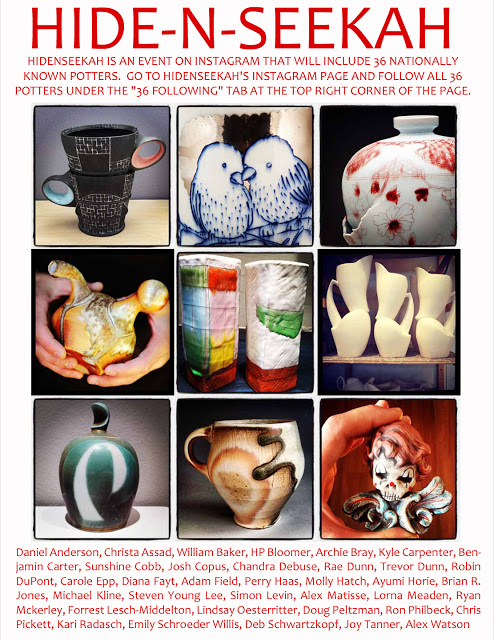 Adam Field (of Adam Field Pottery) came up with a brilliant idea. Its one of those ideas you have to just love because it’s not motivated by marketing or sales – it’s core goal is to build community. Simple. Adam figured that it would be great to figure out a way to build the clay community on the instagram platform. Already there are tons of amazing artists posting their work, their lives, behind the scenes in their studio, what they find inspiring in the world, and well….of course their beloved pets too. But how could we get more clay artists on instagram? How about offer them the chance to find and keep some amazing pots simply by being at NCECA this year and following a group of artists who have donated work. It’s super simple to play along. All you have to do is go to HIDENSEEKAH’s instagram page and follow all 36 potters under the “36 following” tab at the top right corner of the page. Once NCECA starts Adam will be hiding artwork around Houston for you to find. Clues to find each artist’s work will be posted on their own personal instagram feed (which is why you have to follow them all not just HIDENSEEKAH).