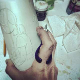 | Carving line drawing through wax on dry greenware. |