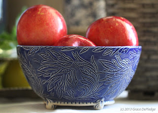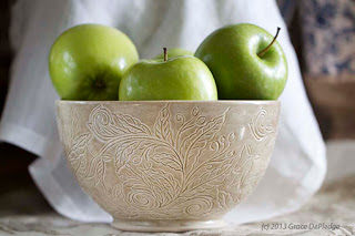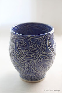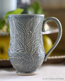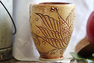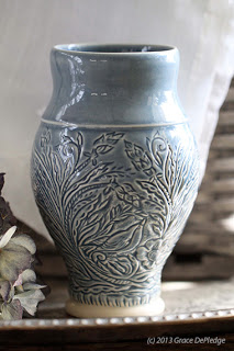 hand, primarily through carving. She hopes her pots bring functional