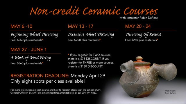 For more information on each course and how to register, please visit the School of Art General Office in 313 ARTlab, email [email protected] or call 204.474.9367