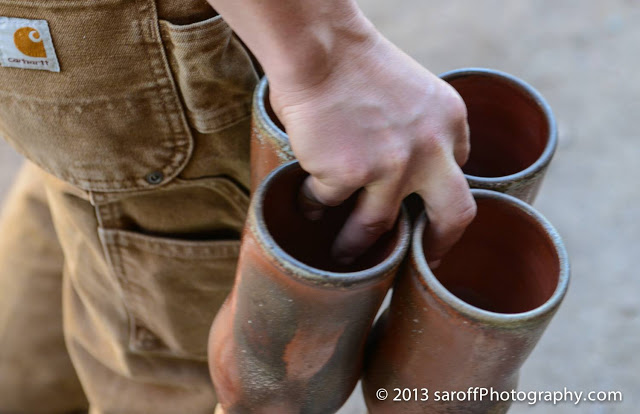 final projects and dipping bisqued cups into buckets of grey goop. In