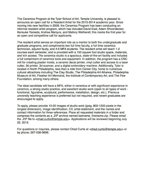 Ceramics Program at the Tyler School of Art is seeking a Resident