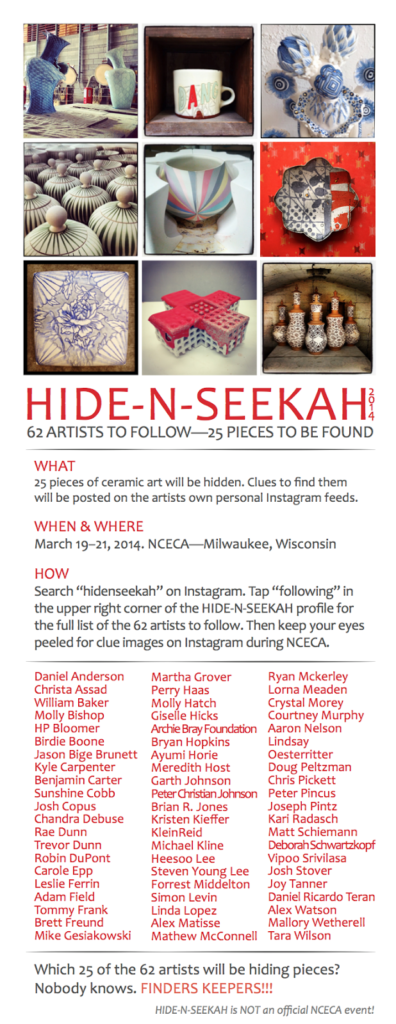 Search “hidenseekah” on Instagram and follow all 62 participating artists (tap “following” in the upper right corner of the HIDE-N-SEEKAH profile for the full list of artists to follow). Keep your eyes peeled for clue images on Instagram during NCECA. FINDERS KEEPERS!!!
