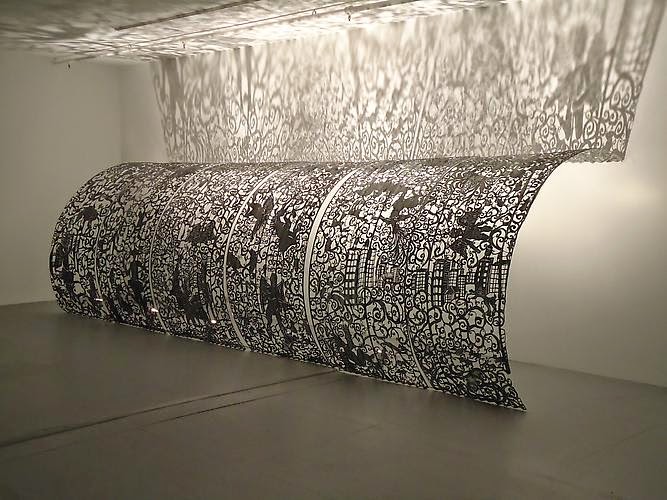 The work of Cal Lane shifts traditionally female ornate sources such as doilies and tablecloths onto metal tools and objects which are traditionally gendered male. She calls to mind all things feminine with her lace cutouts: lacemaking, cake decorating and traditional “women’s work”. Using a plasma torch, Lane makes lace like patterns out of rusted metal objects such as shovels, cars, or other industrial tools and transforms them into fragile, flower-patterned cutouts. I am inspired by Lane’s use of organic patterning and her subversion of traditional gender roles in our contemporary society.