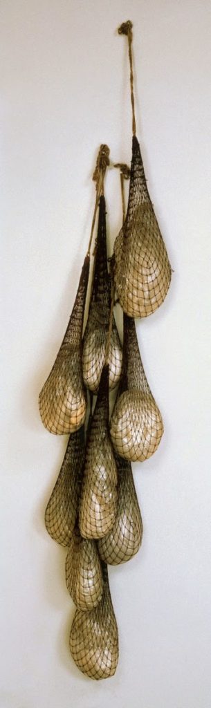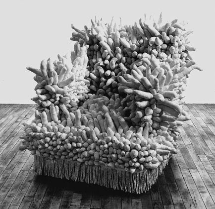 Like Hesse, Yayoi Kusama was also a female artist in New York in the 1960’s, although she spent considerable time in her native country Japan. She began to cover everyday objects with white phallic protrusions, rendering them at once absurd and threatening. She has a very obsessive personality and speaks openly about her mental illness and hallucinations of millions of dots. Her work with accumulations and repetition fascinates me, and I want my work to be simultaneously attractive and repulsive in the same way Kusama’s work operates.