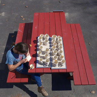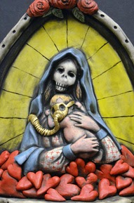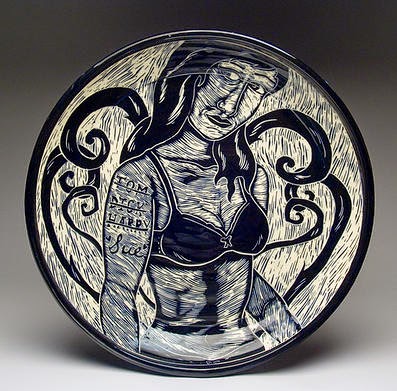 will carve through slip-colored clay (sgraffito) and will showcase other
