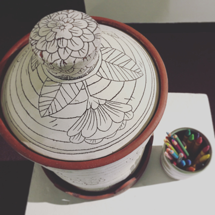 Wheel thrown midrange red stoneware, slips, sgraffito, colored pencils, crayons
