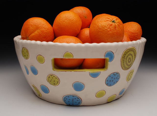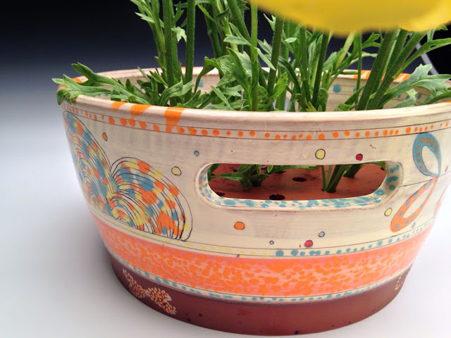 Radasch infuses her pots with inspiration from old Hallmark cards, Copenhagen China, old-school Tupperware, cake, candy, and textiles. The result is delicious pottery that looks nearly edible, like a uniquely decorated cake fit for a child’s birthday party (one of those elaborate cakes made more to show off to the other parents than for the actual child).