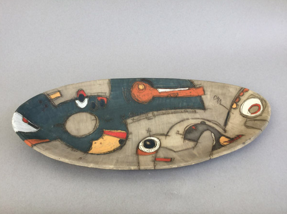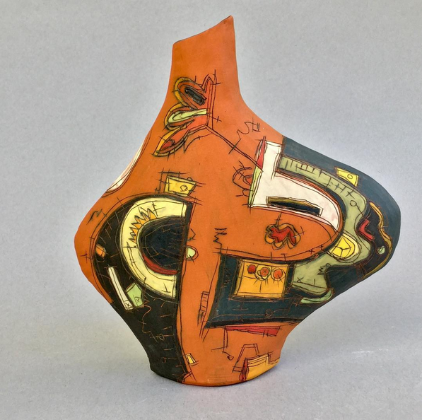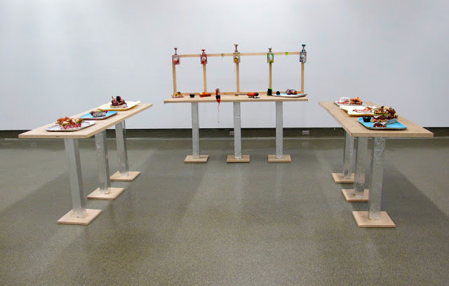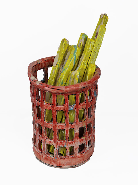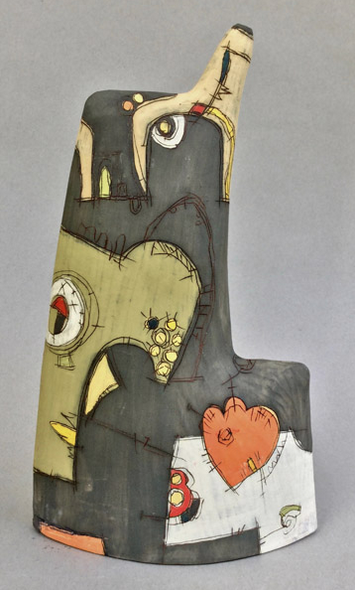 with colorful slips and glazes mimicking sloppy condiments and personal