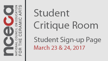 Please come to the conference with your images already prepared and saved to a flash drive. All critiques will be of digital images; please do not bring actual artwork. Laptops will be provided, but NCECA does not provide Internet access in the Student Critique Room. Only current student members are eligible to sign up for a critique.