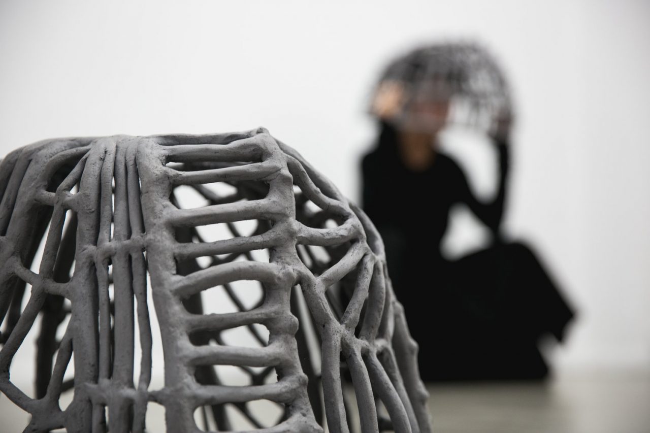 Through her analysis and in the exhibition taking place, they become tangible, as to allow a closer observation, as if we could even try them. Face lines converted into ceramic pieces strengthened by fire and shattering if mishandled. These fine bone structures are here engaged in a ritualized course, their brittles taken by fluids and movements, turning back into sediments, as the objects are activated by their dissolution.