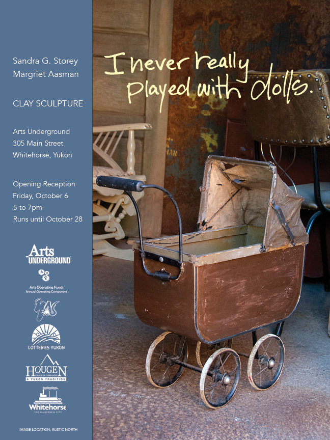 Margriet’s statement: By way of my wonderful career with Aasman Brand Communications, I know how much better I can be as a creative individual through teamwork. Missing colleagues, and needing help to master a brand new medium, I looked for a mentor. I have been so blessed to find one here in the Yukon, in the person of Sandra Storey. This show is about our special relationship, breaking down barriers to learning the technical skills, problem solving creative solutions, and stepping out of our comfort zone to push creative concepts. Developing our show based on dolls, from our personal experiences and perceptions to creative projections, has been so much fun! Although I love what was created, it is really about the process and a daily focus on living a purposely creative life.
