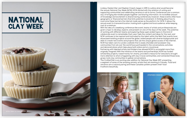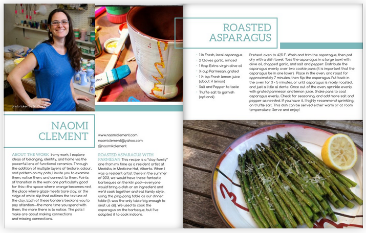 Okay so this isn’t a typical Monday Morning Eye Candy for musing about mud, but hopefully you can forgive me this week. I’ve been working with National Clay Week over the last year on this amazing publication that showcases a range of ceramic eye candy and talent from across Canada. We’ve paired up gorgeous pots with mouth watering recipes to entice you to pull those beautiful pots in your collection out of the cupboard and use on a daily basis.