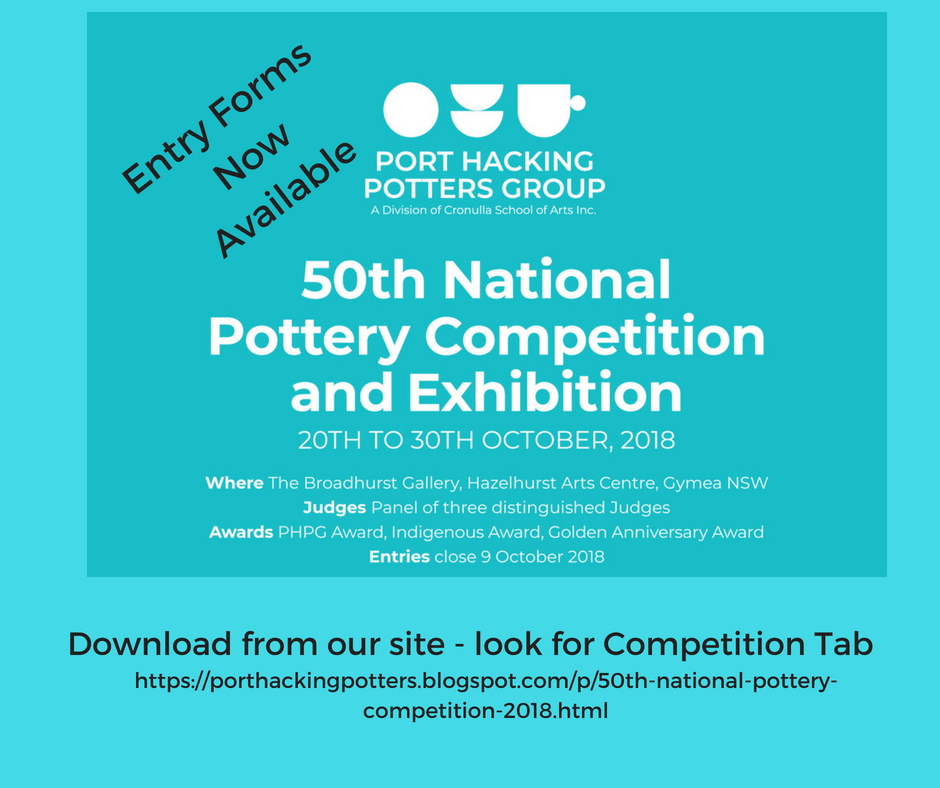 The Port Hacking Potters are based in Cronulla a suburb of Sydney NSW Australia and this year will celebrate their 50th National Pottery Competition in October 2018. Call for entries is now open and closes 9 October 2018. No International entries but entries from any state in Australia are welcome. Read all about it from this link on the Australian Ceramics website: https://www.