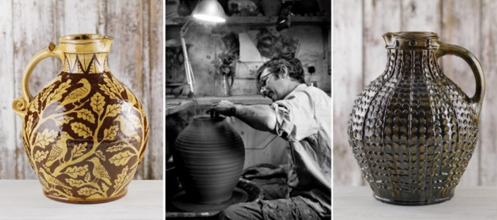 We share materials, working in red earthenware, decorated with a self-imposed restricted palette of coloured slips, covered with rich honey glazes. The pots are fired in the wood kiln, which we stoke continuously for up to twenty hours. Subsequently we travel together to shows up and down the country, selling our wares. Our life is our work and our work is our life, we live and we breathe pottery.”
