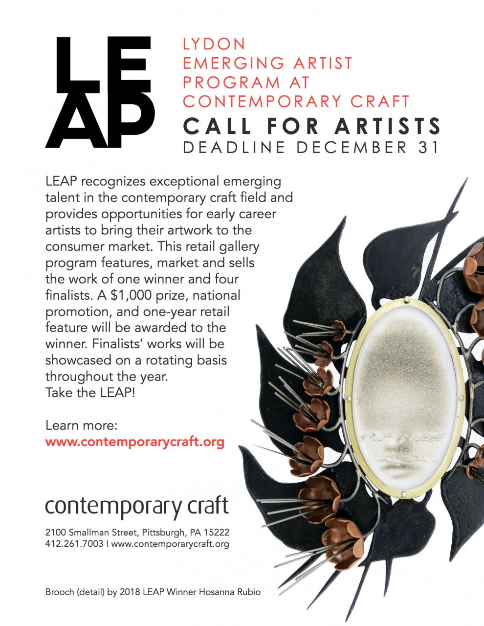 LEAP is open to exceptionally talented graduate students and/or emerging artists who are beginning to receive recognition for their work, but are not currently represented by well-established galleries. Artists must work in craft media: ceramics, wood, metal/jewelry, glass, found materials, mixed media, fiber or a combination of these materials.