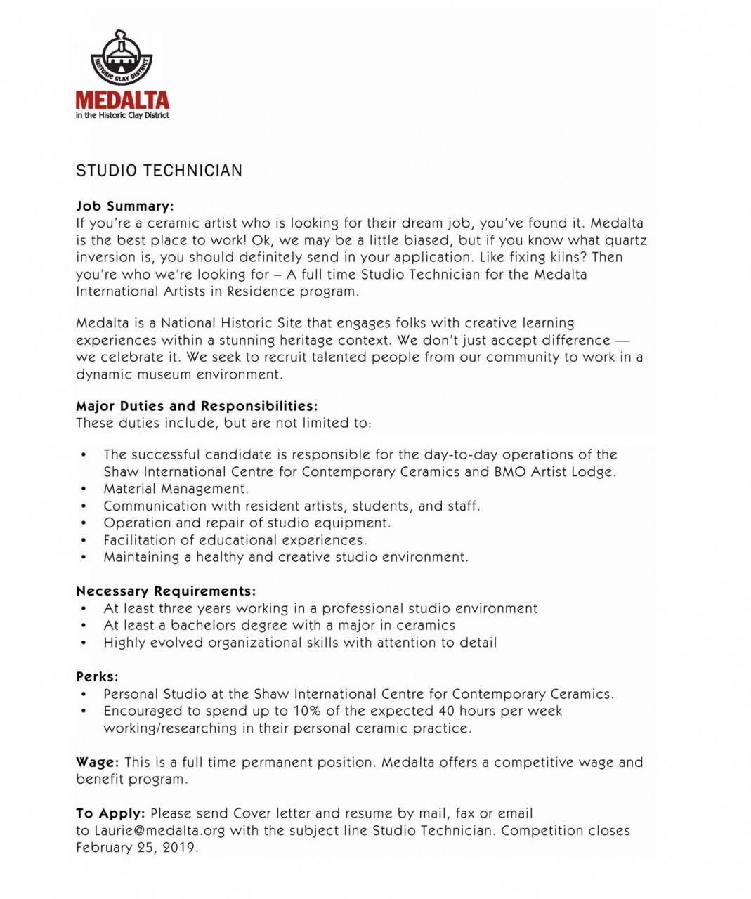 job posting: Studio Technician @ Medalta
