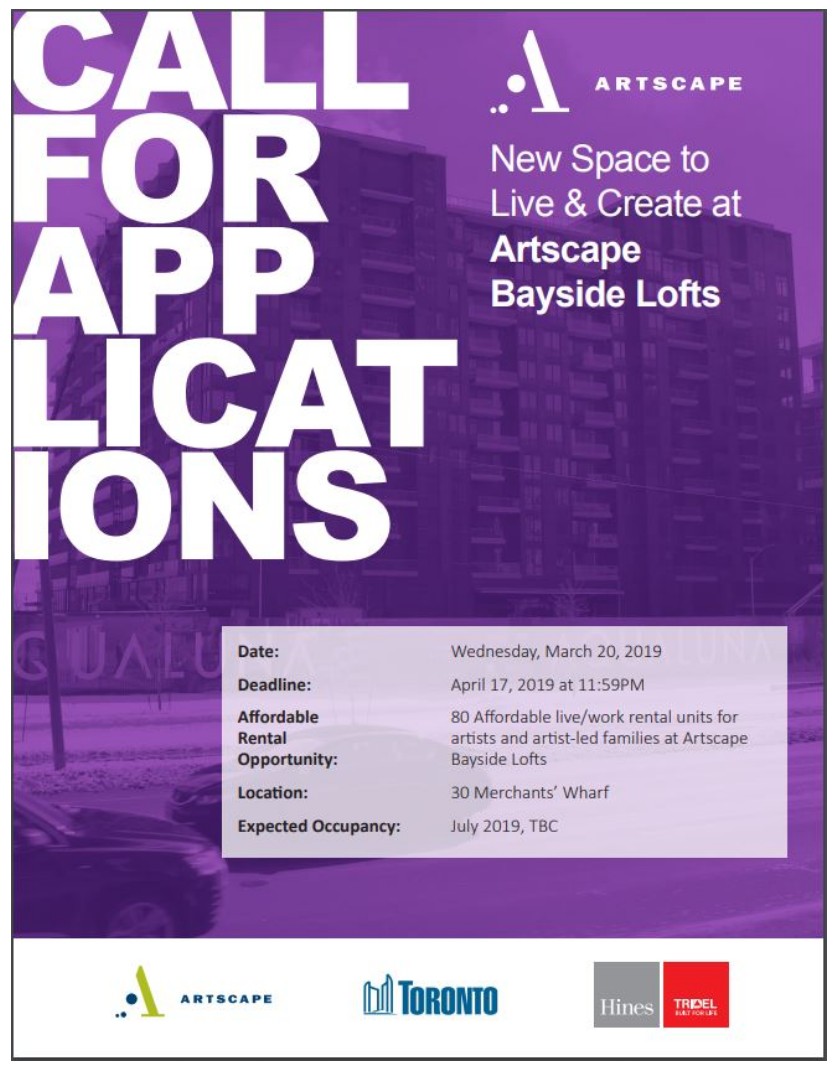 The call for Artscape Bayside Lofts tenant applications closes on April 17, 2019 at 11:59 p.m.