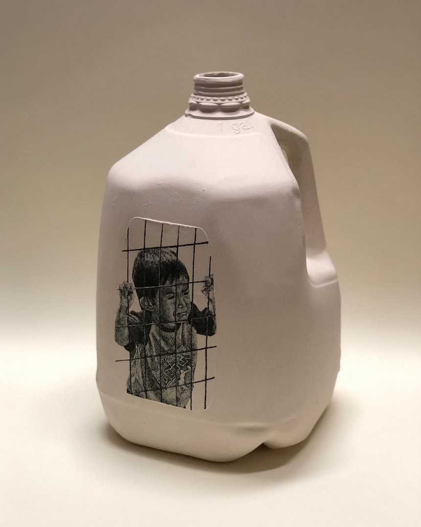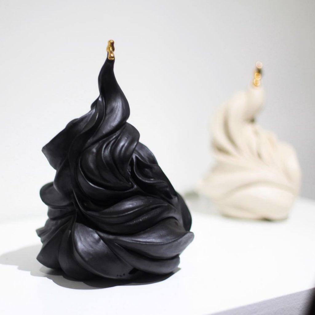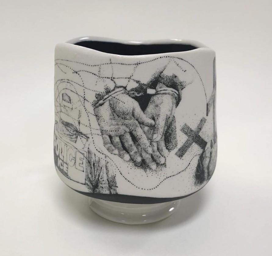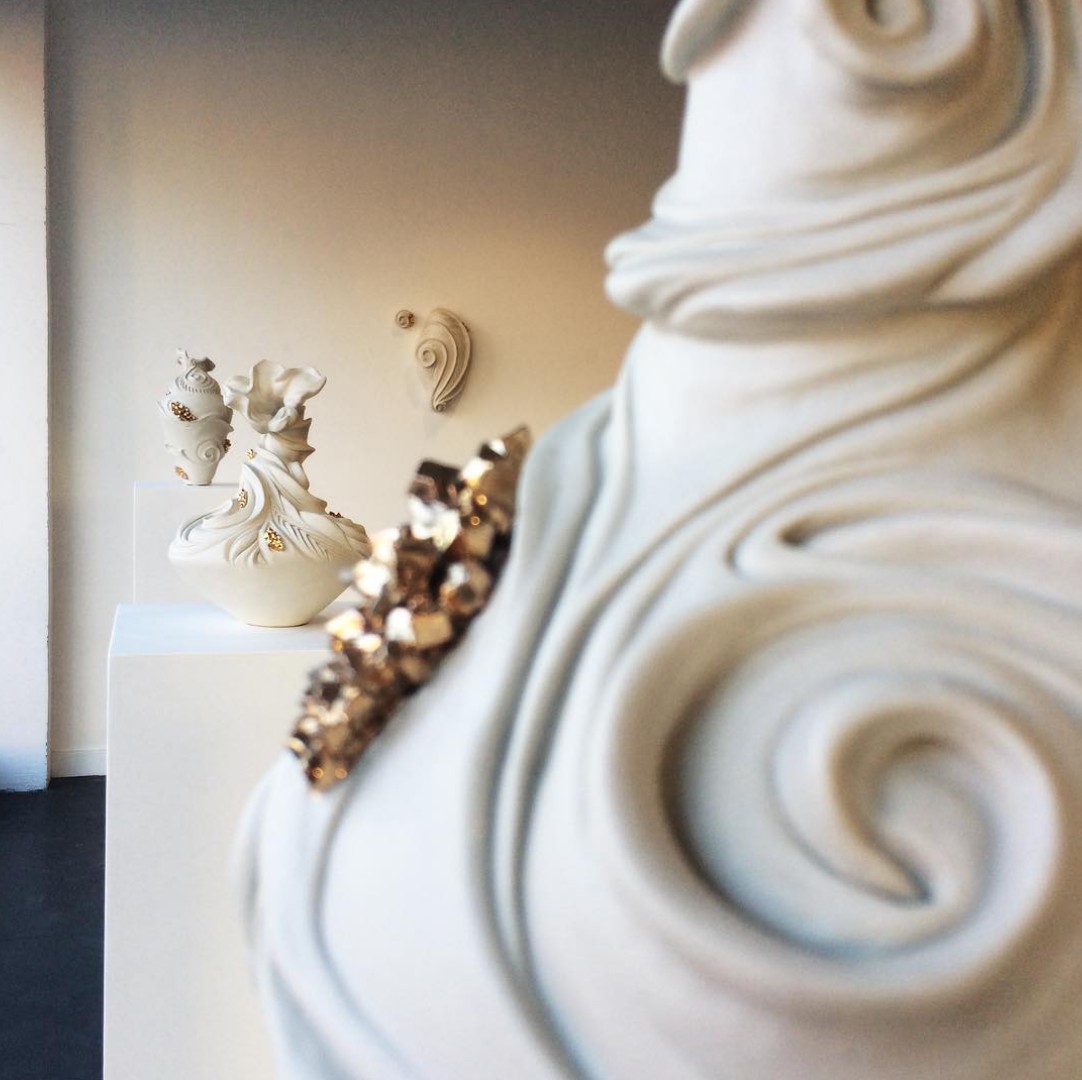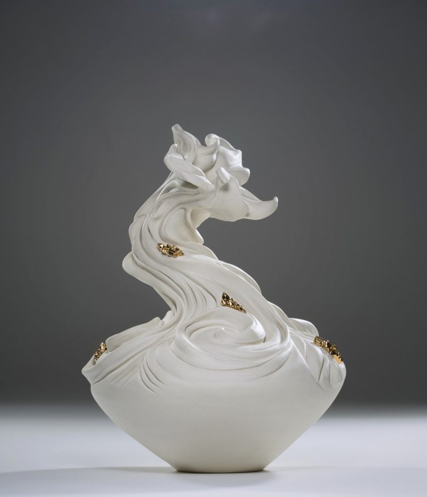 “The silhouette of each work is based on classical vases, but the ornate decoration, flashy displays of gold and sense of individuality, removes the piece from a pure utilitarian function. These works toe the line between appreciating the object for what it is, and trying to impose a role for it to play. Hold a flower, be a vessel. They are a response to the idea of being created for a specific purpose/usefulness within the confines of a heteronormative capitalistic society. Birth, work, marriage, reproduction. Through my radical emergence I get to chose what my form and function will be.”