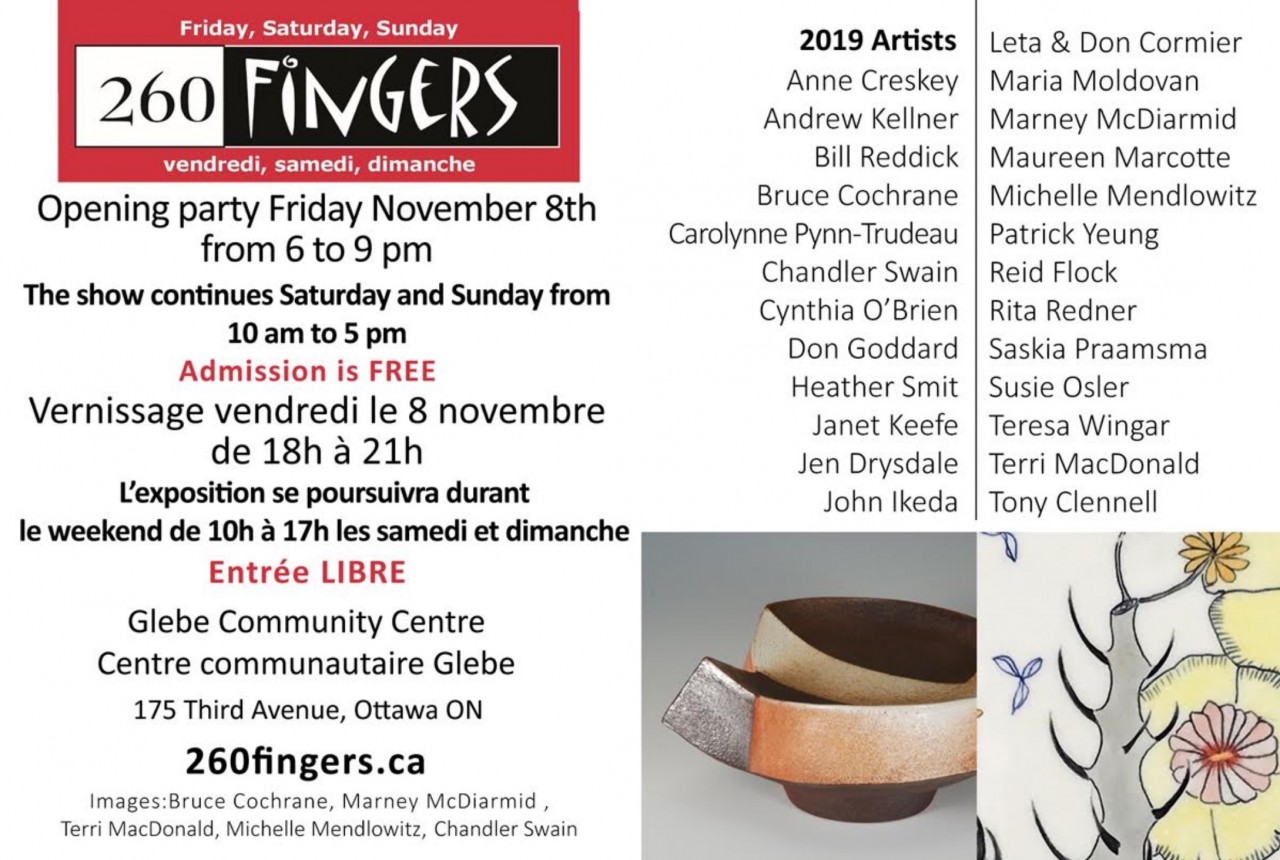 Participating artists for 2019 are members Anne Creskey, Bill Reddick, Carolynne Pynn-Trudeau, Chandler Swain, Cynthia O’Brien, Don Goddard, Heather Smit, Jen Drysdale, John Ikeda, Leta & Don Cormier, Maria Moldovan, Maureen Marcotte, Reid Flock, Rita Redner, Saskia Praamsma, Susie Osler, Teresa Wingar and guests Bruce Cochrane,Tony Clennell, Andrew Kellner, Terri MacDonald, Patrick Yeung, Michelle Mendlowitz, Marney McDiarmid, and Janet Keefe. To see more about their work visit: www.260fingers.ca