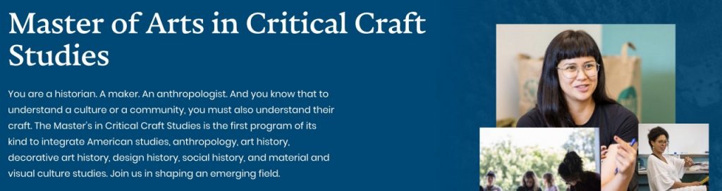 The MA in Critical Craft Studies is a low-residency graduate program in craft history and theory. This full-time, four-semester/ five-residency program is the first of its kind in the US. Students and faculty meet for two weeks of lectures, workshops, seminars, readings, project work, and individual conferences each July and January. The two-year continuous program begins in July; all July residencies are held on the Warren Wilson campus, and January residencies are held in downtown Asheville with classes at The Center for Craft. Students return to campus for a fifth and final residency to present their final projects in a public colloquium, co-organized by Warren Wilson College and The Center for Craft. Students work individually and collaboratively during residencies the following semester terms. Each student spends 20-25 hours per week on readings, writing and research assignments, meetings with mentors in their place of residence or online, online faculty sessions, and group meetings. Coursework builds critical thinking, research methods, and experience with formats ranging from writing and podcasts to exhibitions and curriculum development. Final projects demonstrate applied knowledge in craft histories and theories, and may include: a journal-article length thesis; an exhibition with essays, programs and texts; curricular development with lectures; a scholarly conference with publication; a podcast series; Object Library development; or a series of short critical essays.