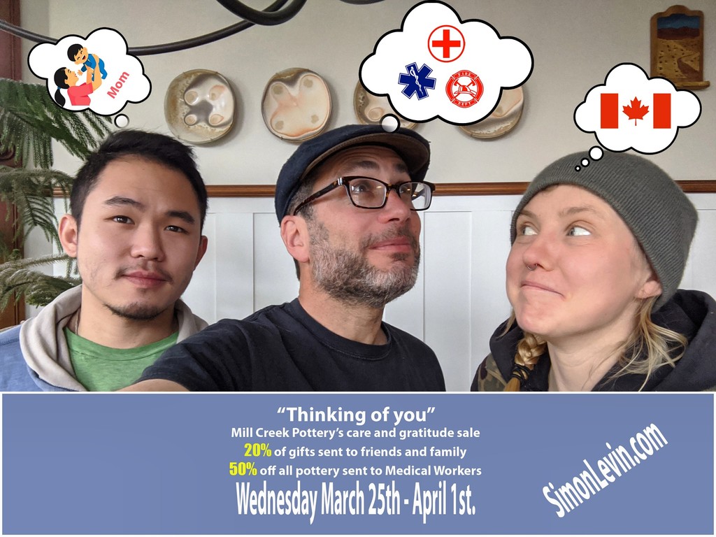 We are all sheltered here at our home or huddled together at the pottery, not going out; beyond attempts to not drive each other crazy. We are missing working together and we are missing our friends and family. The speed at which the world is changing, the data on the number of people dying alone, and the unknowns about our economic futures are all overwhelming. Add to that the isolation necessary to limit the damage of this pandemic and loneliness floods in. Connection and gratitude are the salve to fear and frustration. I was talking with my apprentice Daniel Pfohl about these things and he spoke of a conversation he had with his father. Dan’s father runs a foundation that promotes the care of caregivers (DavidsRefuge.org) where he suggests that if we each call one person we have been out of touch with each day, and they call one person each day, and so on a radiating spread of love and connection will emanate forth building and growing, supporting and unifying us all.