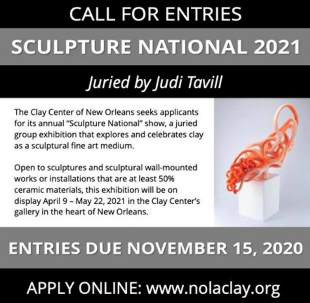 The Clay Center of New Orleans seeks applicants for its annual “Sculpture National” exhibition, a juried group show that explores and celebrates clay as a sculptural fine art medium.