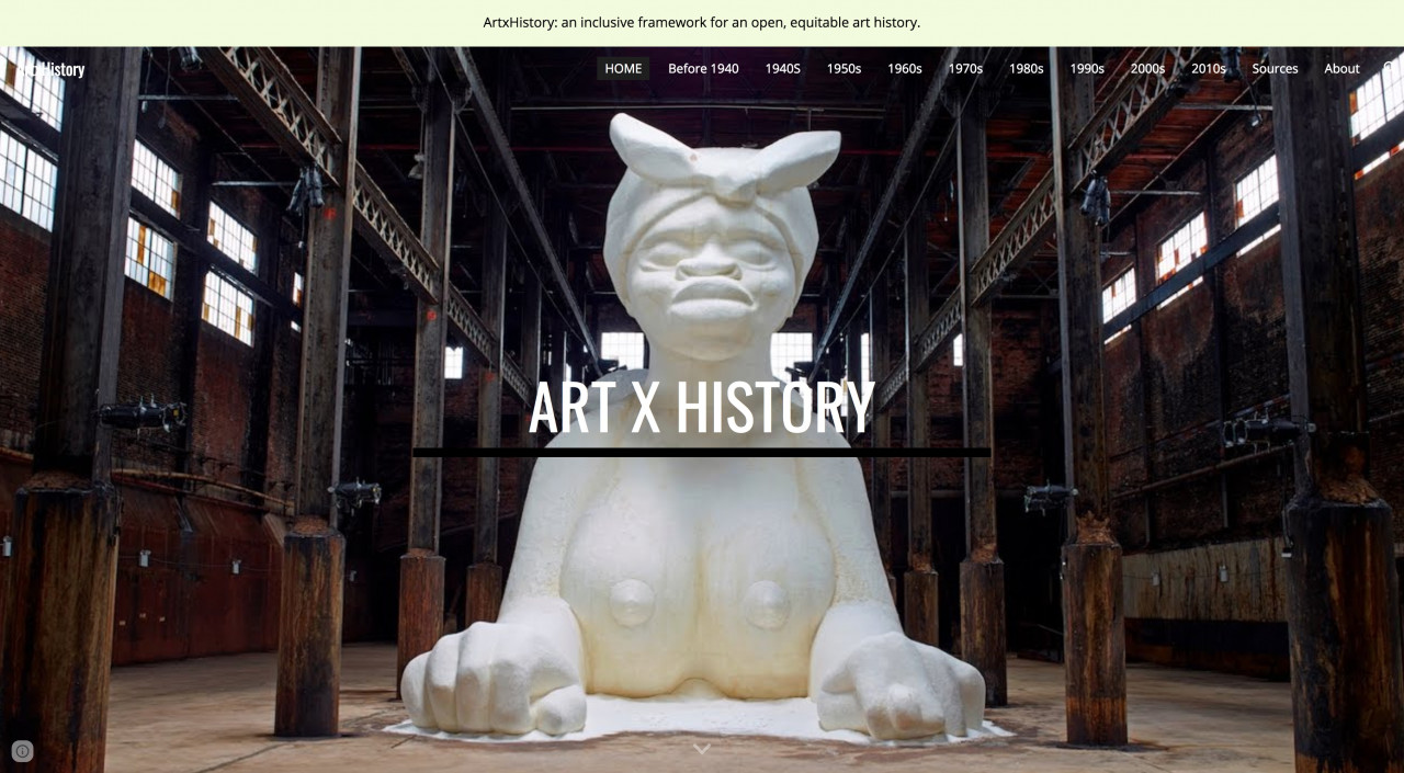 “Purpose & Functionality: ArtxHistory is an education resource of commonly available images, videos, mini-lectures and scholarship of the decades which influenced or defined modern through contemporary art. Most links are concise in content, of prevalent works of art in the early or mature stage of an artist’s career, sourced from museum, academic, journalistic and for profit institutions. ArtxHistory is offered as an alternative to a textbook, relieving users of cost as content online is increasingly available. The core intent of ArtxHistory is to offer an art history that replaces the dominant white, male, heteronormative, advantaged, celebrity narratives for a more inclusive history balanced with the work of women, artists of color, LGBTQIA+ persons, intersectional makers, and the self-taught. Reflected by the diaspora, America, particularly New York based practices, are an overriding locus of investigation. While pointing toward a decolonized art history, ArtxHistory is not comprehensive nor free of biases. Artists and scholars are welcome to use and facilitate in the development of ArtxHistory for a more open, equitable, engaged classroom. This project is an act of love for the artists’ who pose the necessary questions of our time, and for our students who deserve to see all of those questions.”