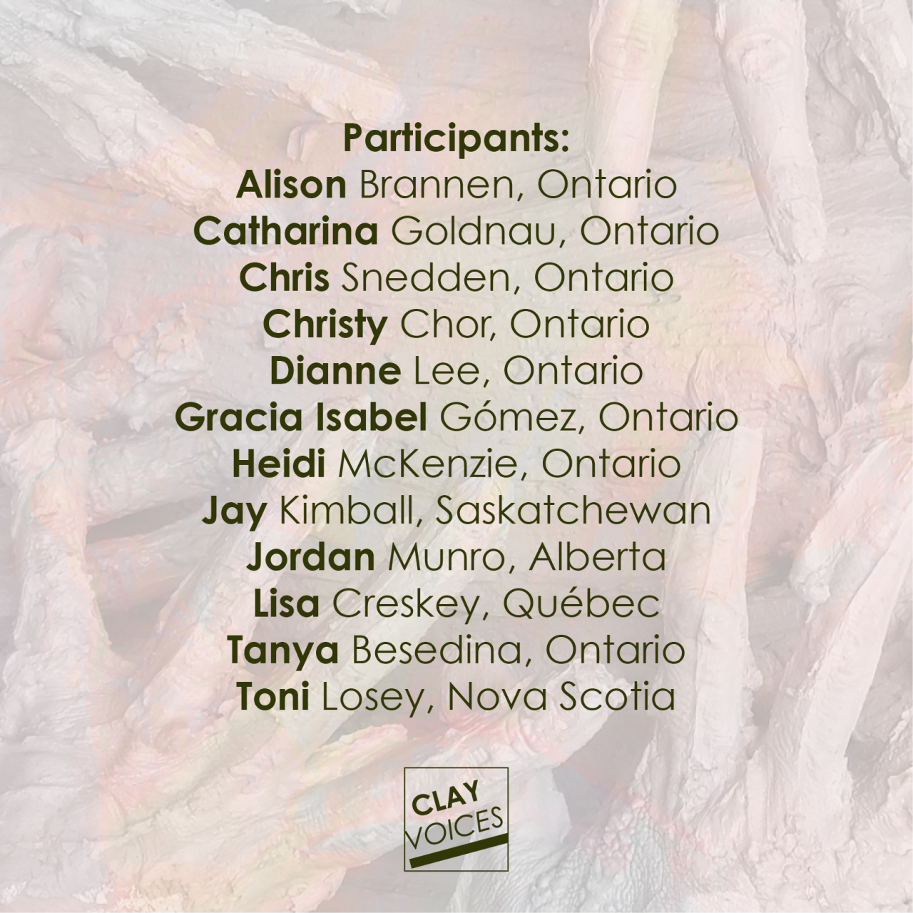 Chris Snedden; Christy Chor, Dianne Lee, Heidi McKenzie and Tanya Besedina (ON); Jay Kimball (SK), Jordan Munro (AL); Lisa Creskey from Québec and Toni Losey from Nova Scotia. Presenters will open their studios and hearts to share with CLAY Voices followers some of the strategies they have set in place lately to keep their practice alive. To know more, follow @clayvoices and stay tuned.