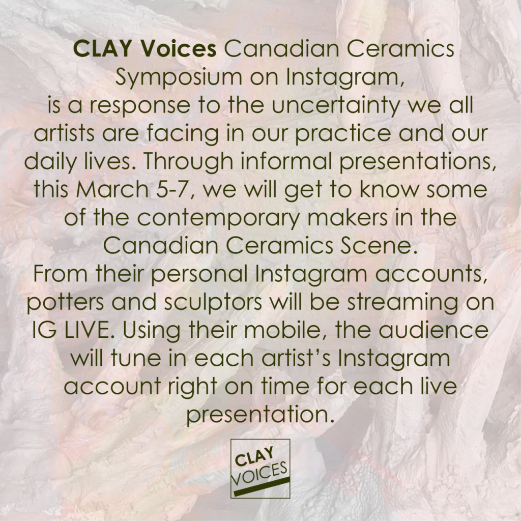 Last year in June, CLAY Voices on Instagram, Canadian Ceramics Symposium was born in the middle of a global pandemic. This initiative was -and still is a response to the uncertainty we all artists were facing and its impact in our practice and our daily lives. The goal was to connect ceramic artists across Canada during the lockdown. The enthusiastic response revealed how much we miss our people.